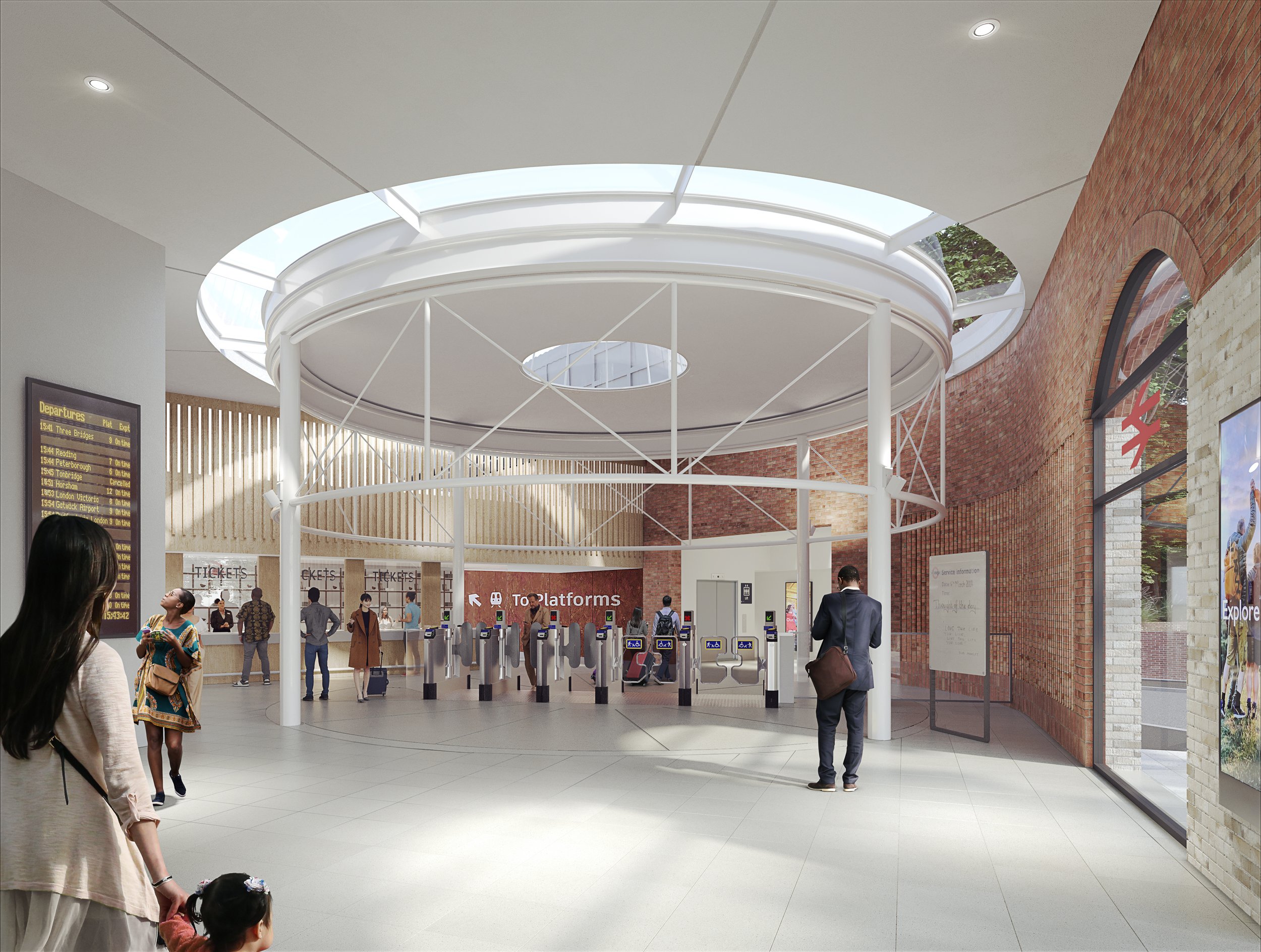On the west, the ‘bricky’ language will carry through into the station’s interior with honey-coloured brick forming the main internal surface facing the town centre. A pale palette of internal materials gives the new entrance building a lofty, uplifting appearance. The proposal is to retain the central section of the 1990s lightweight steel drum structure, designed by Troughton McAslan Architects, as a freestanding element within the enlarged concourse volume. A ring of roof lights around its perimeter allows it to ‘float’ within this volume and form a logical location for repositioned ticket gates on the centreline of the drum.